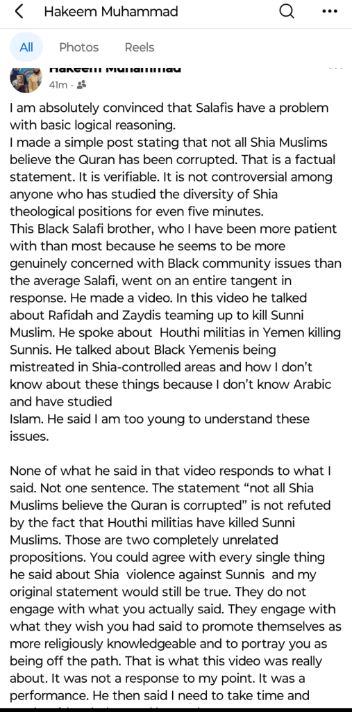 You have also stated that you are writing a book addressing alleged anti-Blackness among Salafis in America. However, your current engagement in promoting or defending Shia theological positions has no direct relevance to Black communities. This contradiction raises legitimate concerns regarding your priorities and analytical framework.